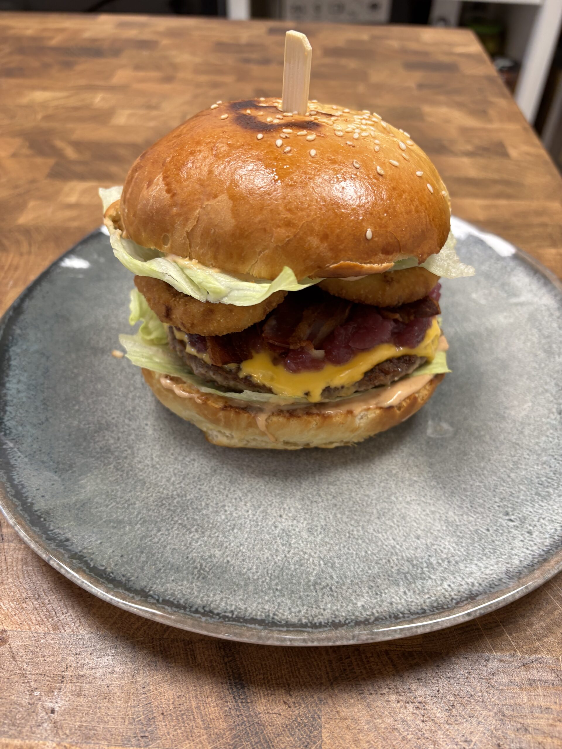 100 g marhahús, jégsaláta, lilahagymalekvár, cheddar sajt, bacon, 3 db hagymakarika