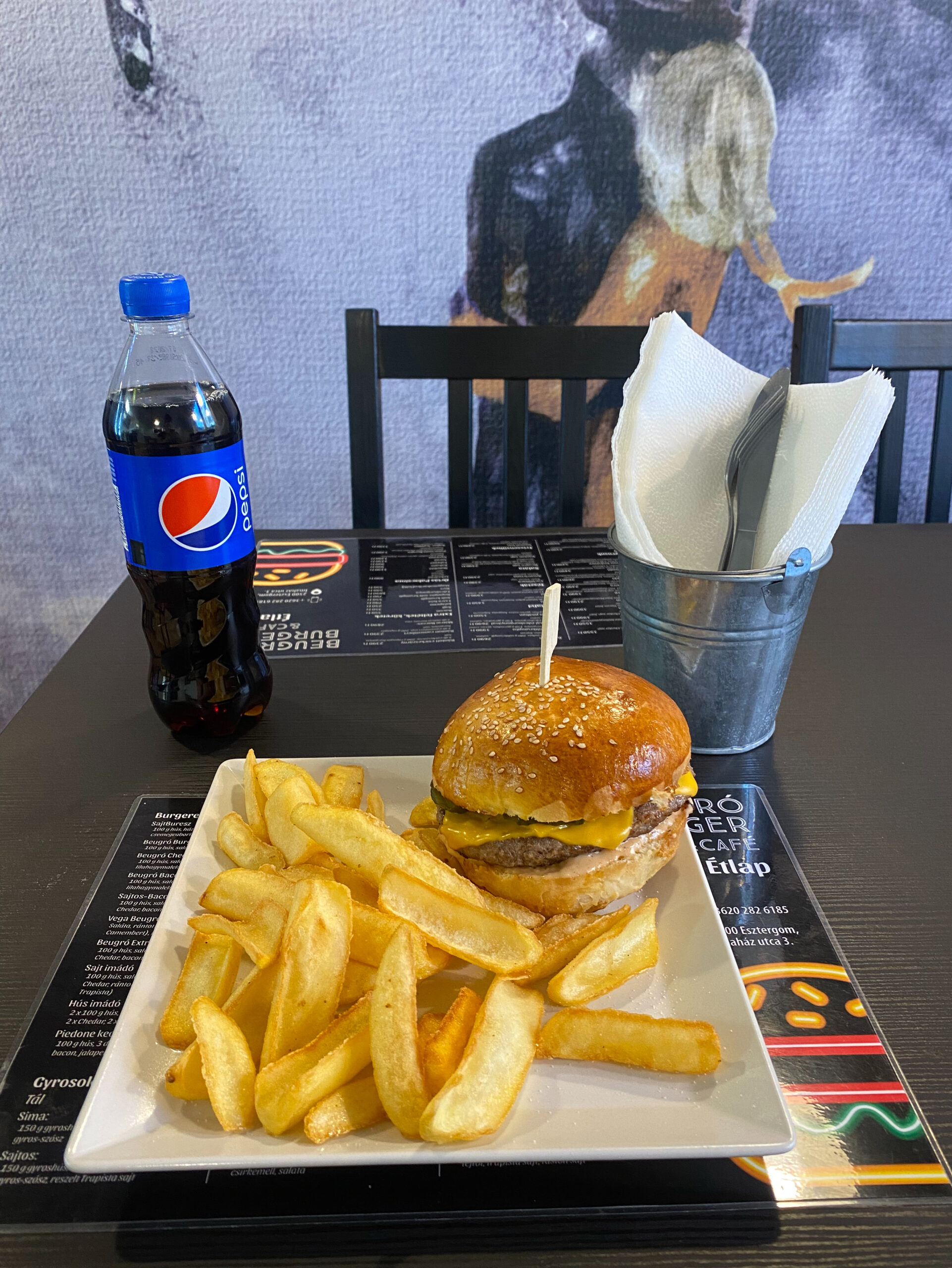 100 g marhahús, házi szósz, cheddar sajt, csemegeuborka